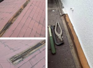 劣化した棟板金や役物を撤去し、屋根の下地の状態を確認します。