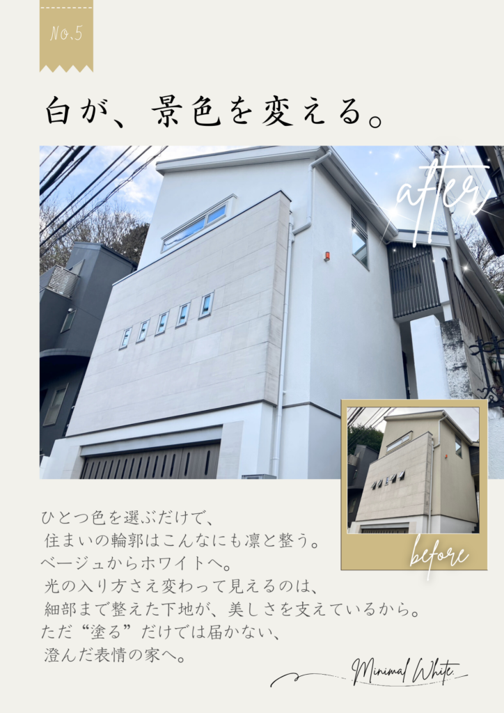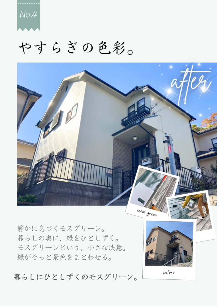 2025 12 外装塗装工事 WORKS ― 暮らしに寄り添う、やさしい外観へ ― 今回ご紹介するのは、外壁塗装の施工事例 No.4。 住まい全体がやわらかく、落ち着いた印象になるよう 色のバランスにこだわった一邸です。 […]